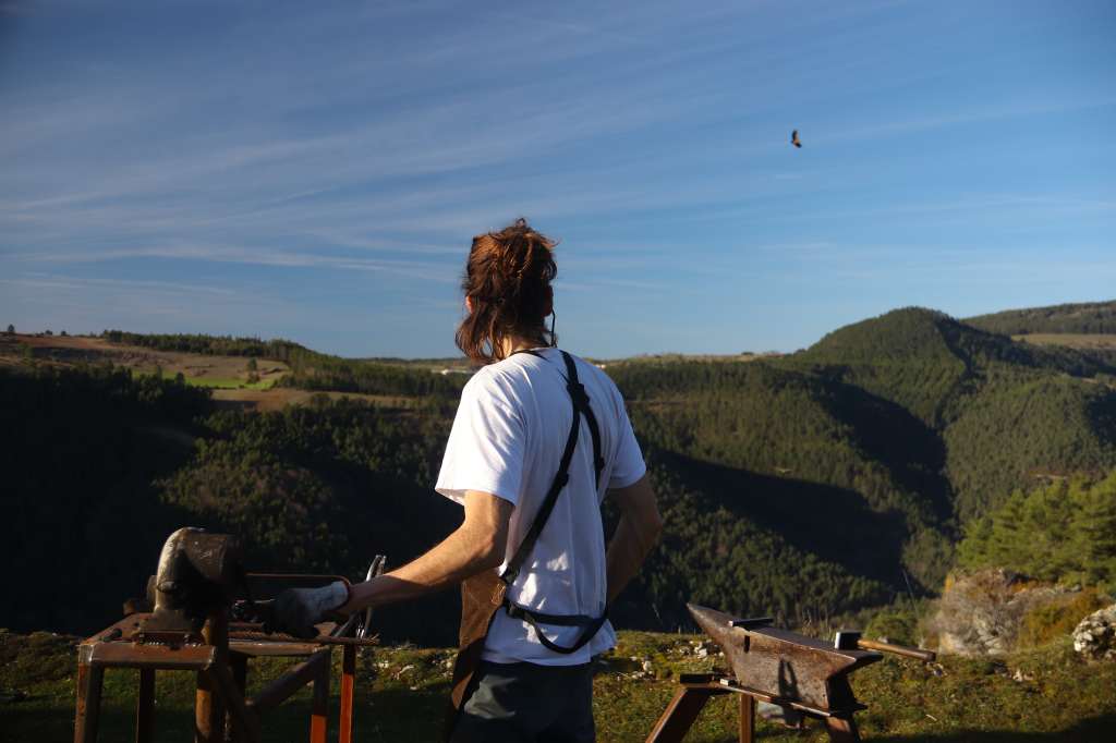 Aujourd’hui j’essaie de forger une image de cette main. Nous sommes à Comeyras, plateau Lozérien au-dessus duquel les vautours planent et me fascinent, déjà un an que j’avais en ligne de rêve l’entretien du feu au dessus de cette falaise.